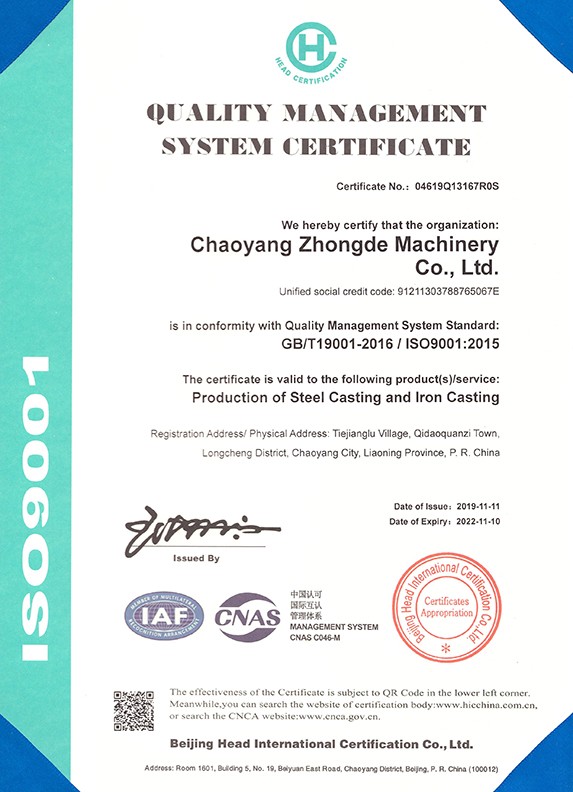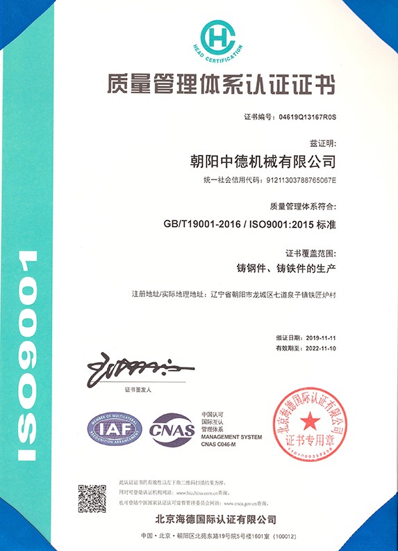 朝陽(yáng)中德機(jī)械有限公司座落于有著“東方佛都”之稱的三燕古都,歷史文化名城——朝陽(yáng),具體位置朝陽(yáng)市龍城區(qū)七道泉子鎮(zhèn)鐵匠爐村。公司創(chuàng)建于2006年5月是一家以鑄鋼件、鑄鐵件,集按用途設(shè)計(jì)、開(kāi)發(fā)、生產(chǎn)、銷售于一體的,為機(jī)械設(shè)備配套的生產(chǎn)型公司。公司注冊(cè)資金1000萬(wàn),固定資產(chǎn)投資1480萬(wàn)元,主要生產(chǎn)設(shè)備GGW-5T,GGW-10T,GGW-10T中頻感應(yīng)爐;GDY-13C高溫電阻窯、GDY-9.5C電阻窯,M4000型直讀光譜儀,DP-3985型硬度測(cè)試儀,倒置式金相顯微鏡、拉伸試驗(yàn)機(jī)、超生波探傷儀,檢測(cè)手段完備。